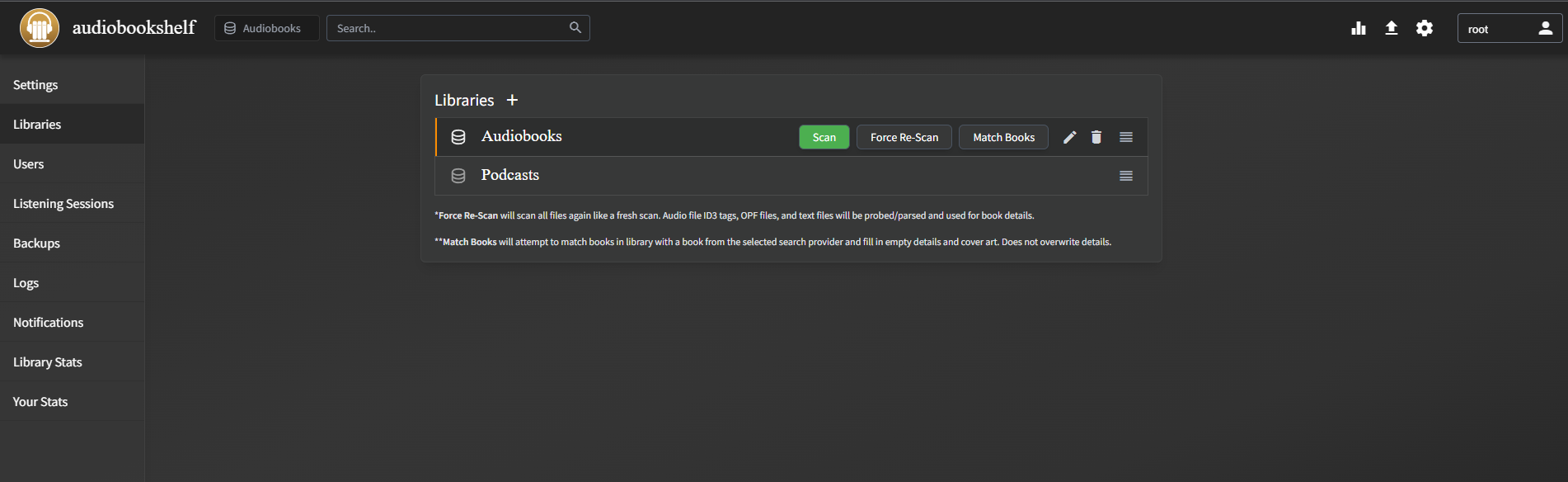 It is also possible to upload via the WebUI. When files are uploaded this way, it is also be placed in the audiobooks folder. However, it is not possible to add more files via the web upload once it’s scanned.