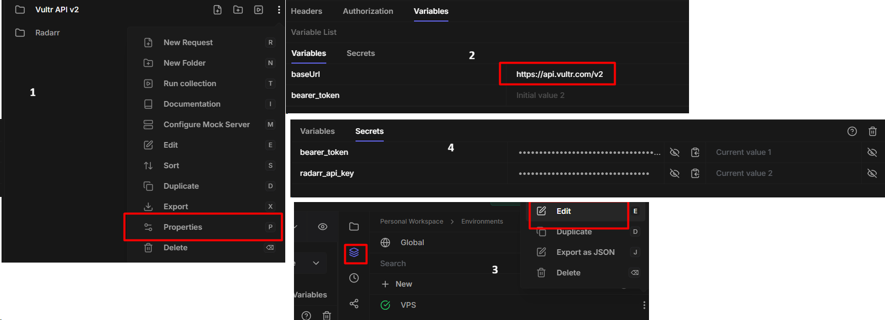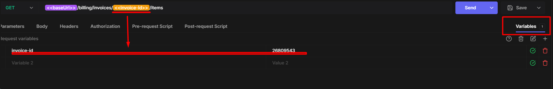 2. Verify or create variables for base URL and API keys.
