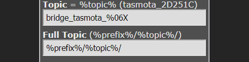• by default the full topic is /tele which is the prefix and ./bridge_tasmota_%06X which is the device name of the bridge